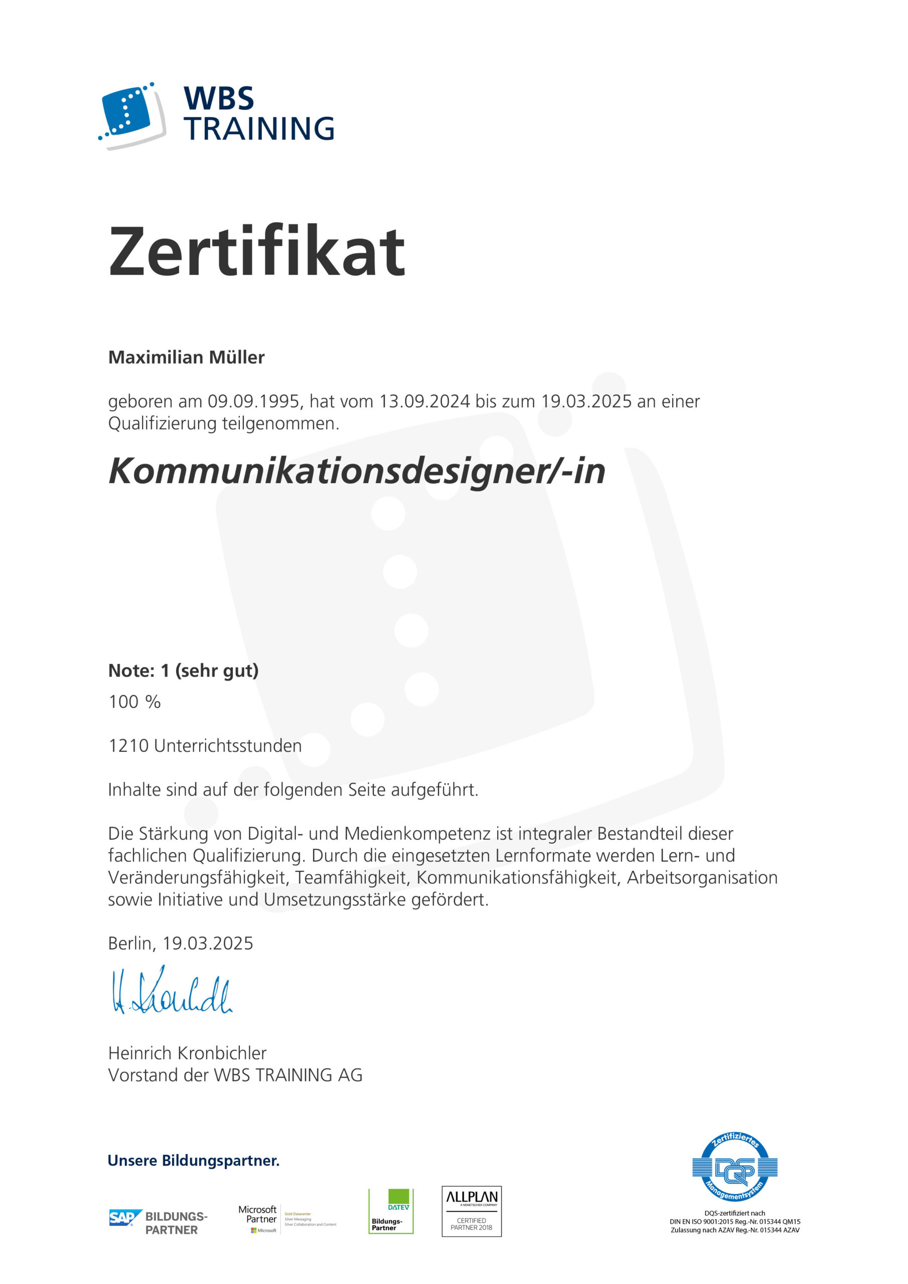 Nach meiner Tätigkeit bei Polyform Kunststofftechnik GmbH & Co. Betriebs KG absolvierte ich eine Weiterbildung zum Kommunikationsdesigner bei der WBS Training. In diesem Rahmen erweiterte ich meine gestalterischen Fähigkeiten um visuelle Kommunikation, Branding, Grafikdesign und digitale Medien. Ich lernte, Botschaften gezielt und kreativ über verschiedene Medien zu vermitteln und setzte Designprojekte in den Bereichen Print, Web und Marketing um. Diese Weiterbildung hat meine Designkompetenzen sowohl im technischen als auch im kreativen Bereich ergänzt und mir ein fundiertes Verständnis für Kommunikationsstrategien und visuelle Gestaltung vermittelt.